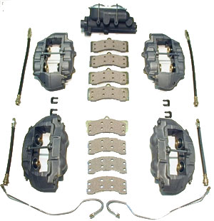 Complete Brake Kit consisting of 4-Stainless Steel Sleeved Brake Calipers, 4-Sets of Premium Brake Pads, 1-Master Cylinder, 4-Rubber Brake Hoses, 2-Steel Trailing Arm Brake Lines, 4-Pad Pins with cotter pins, 4-Horse Shoe Clips (Core deposit Required {see bottom of page}) |