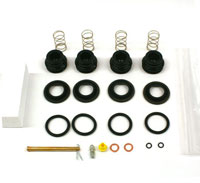Kit For One (1) Front Caliper consists of 4 o-ring pistons, 4 o-rings, 4 boots, 4 stainless steel springs, 2 caliper half o-rings, 1 copper brake hose washer, 1 bleeder screw, 1 pad pin w /cotter pin, 1 inlet plug, 1 plastic caliper bag & 1 Styrofoam block.
