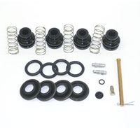 Kit For One (1) Rear Caliper consists of 4 o-ring pistons, 4 o-rings, 4 boots, 4 stainless steel springs, 1 caliper half o-ring, 2 bleeder screws. 1 bleeder screw plug, 1 pad pin w /cotter pin, 1 inlet plug, 1 plastic caliper bag & 1 Styrofoam block.